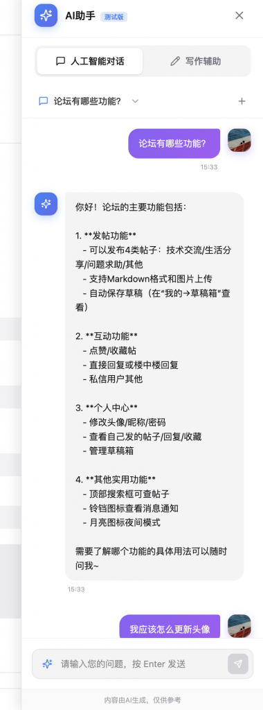 chatService.ts中的FORUM_ASSISTANT_PROMPT,详细列出:- 发帖功能(分类、Markdown、图片上传、草稿)