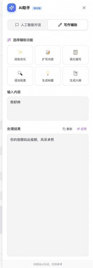 - 两个 Tab:人工智能对话 / 写作辅助